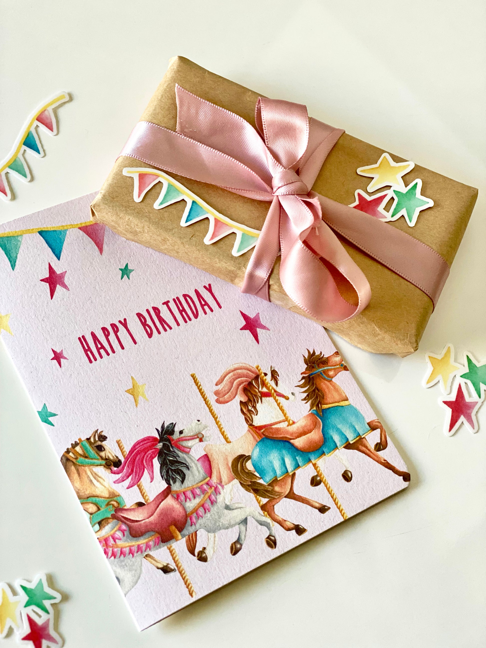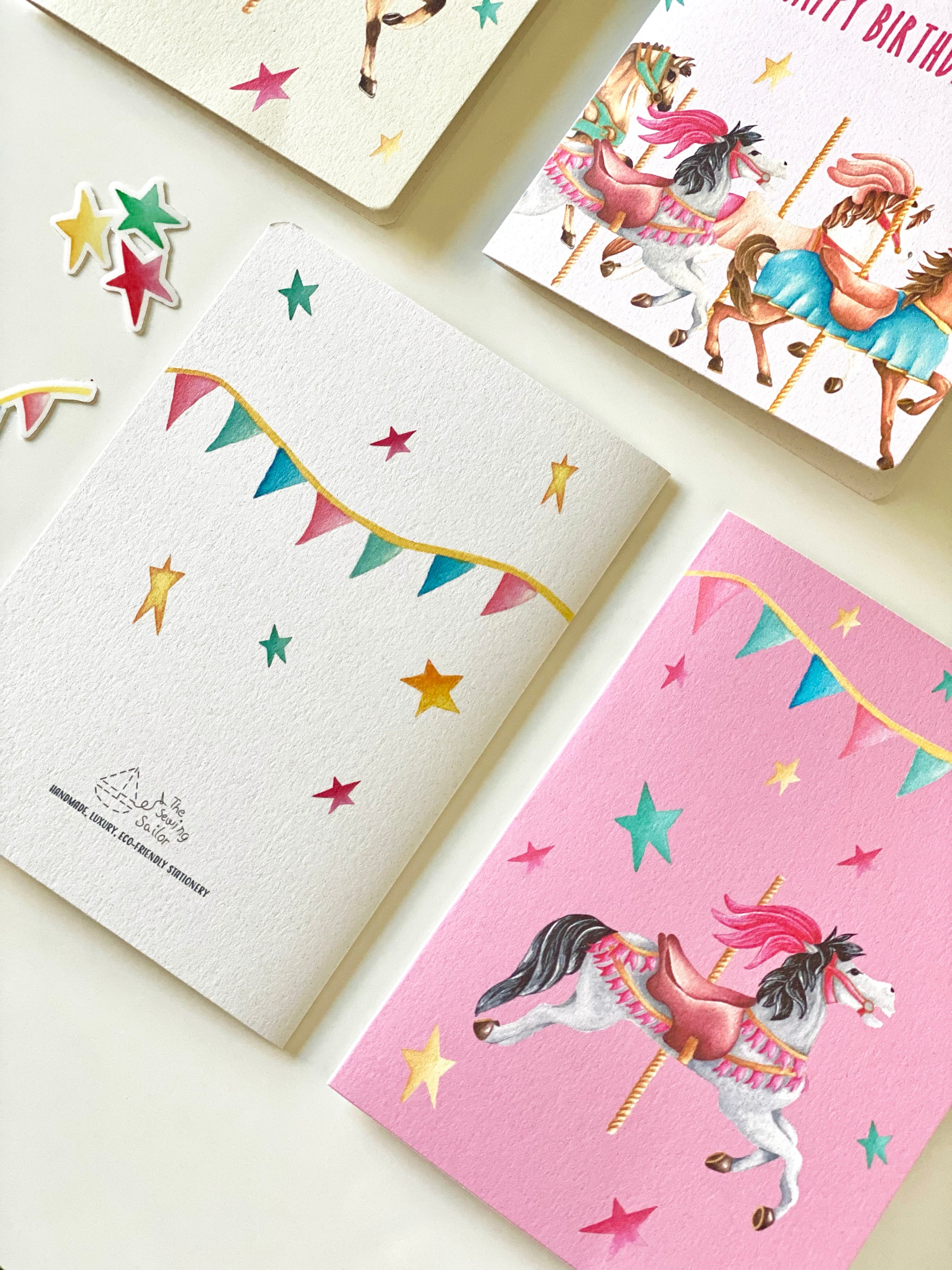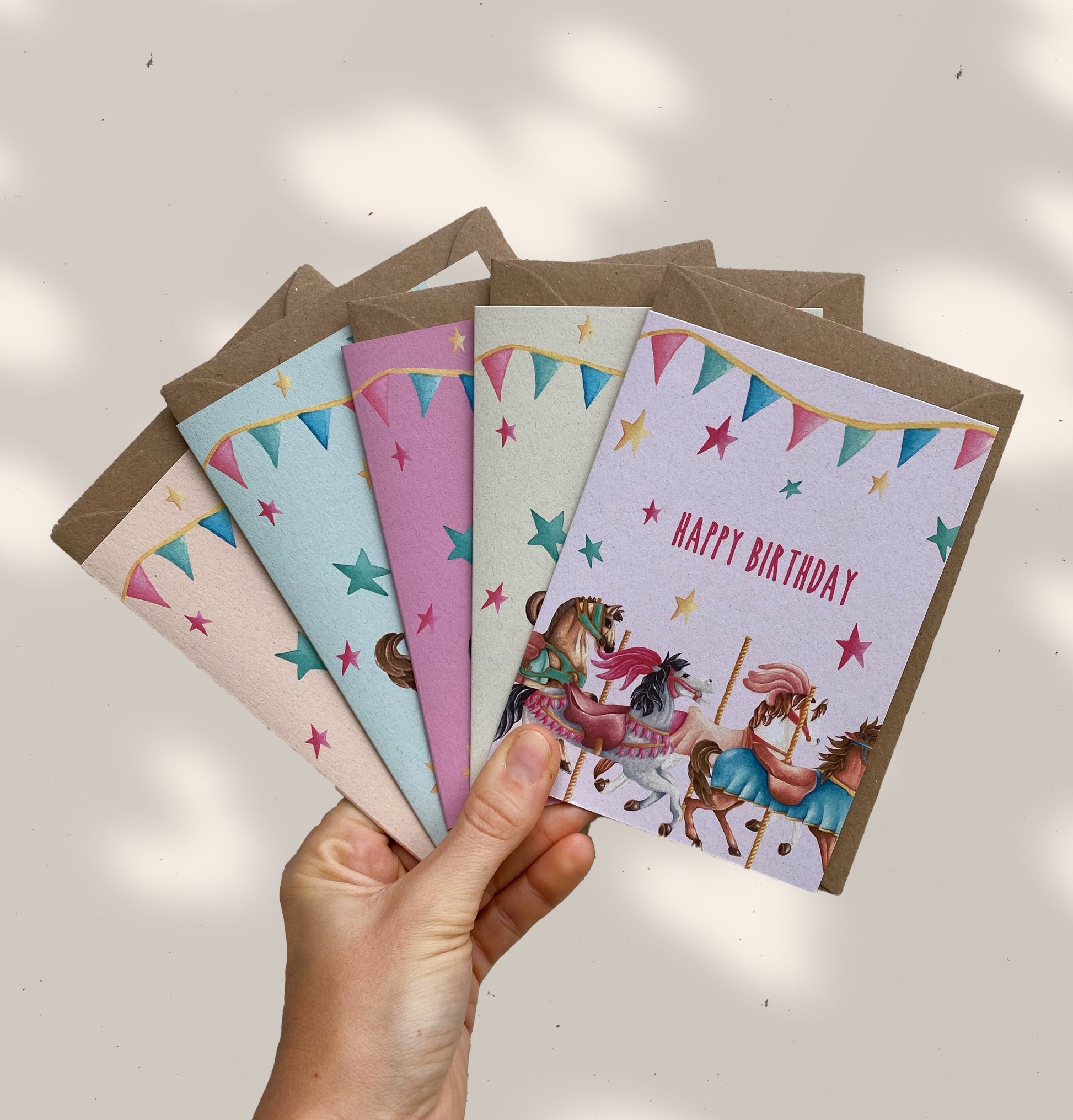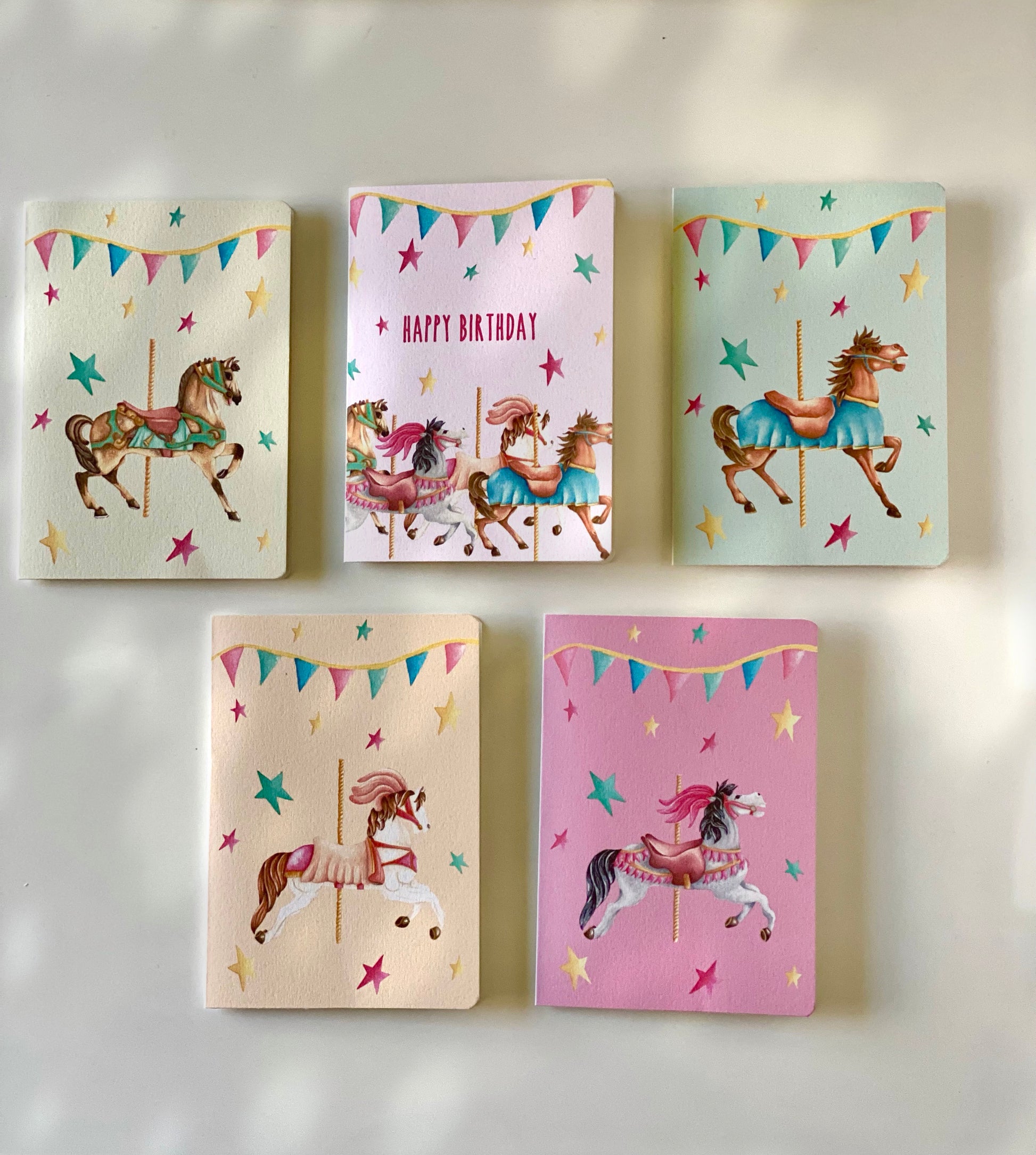 These greetings cards are printed from my original watercolour paintings of a horse carousel.